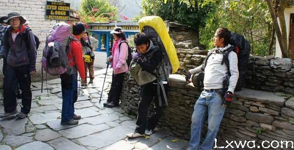 向导和挑夫:徒步前可先联系旅行社,他们会安排行程,并推荐挑夫和向导。也可以自己找向导和挑夫,建议在徒步起点找,比在博卡拉找要便宜。尼泊尔向导一般只带路和做沿途讲解,而挑夫帮你背包。如果你英语流利的话可以找个向导交流,除了了解景点,还能体会到尼泊尔人的风趣幽默。尼泊尔挑夫不是靠肩挑,而是把绳子绑在额头,靠额头和背的力量背东西,一般一个挑夫能背两个40斤的大包,厉害的可以背三个、甚至四个。如果体力还行、喜欢自虐的话,挑夫也完全可以不用请了,沿路都有详细的指示牌,不太可能迷路。挑夫10美金/天,向导15美金/天,不包食宿,但他们的食宿非常便宜,通常只有游客的1/4。